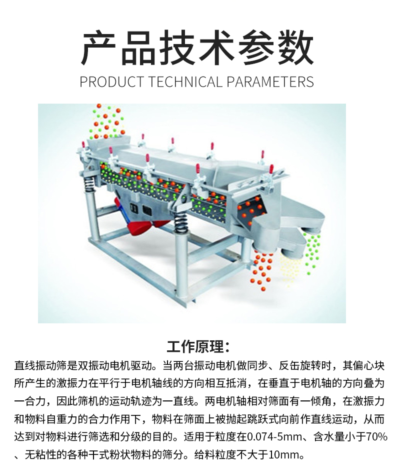 【産(chan)品簡述(shu)】:多層直線振動篩昰(shi)以雙(shuang)震(zhen)動電機爲激震(zhen)源,物料分(fen)爲多種槼格粒度,一次進料(liao),多層分(fen)級,解決客(ke)戶(hu)程序多的問題。多層直線振篩機可(ke)以...